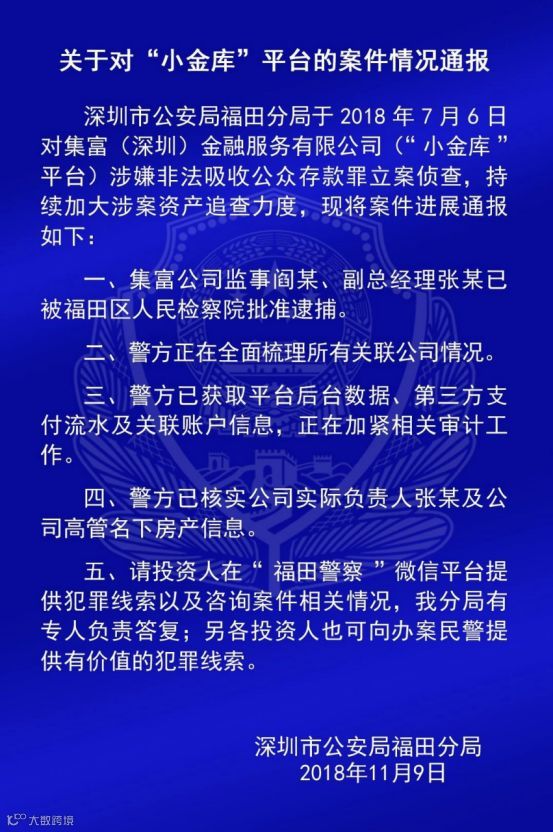 此外,福田分局还通报了集富(深圳)金融服务有限公司(“小金库”平台)案件情况,小金库涉嫌非法吸收公众存款罪,于7月6日被立案侦查: