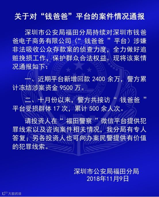 通报显示,福田分局持续对深圳市钱爸爸电子商务有限公司(“钱爸爸”平台)涉嫌非法吸收公众存款的侦查力度: