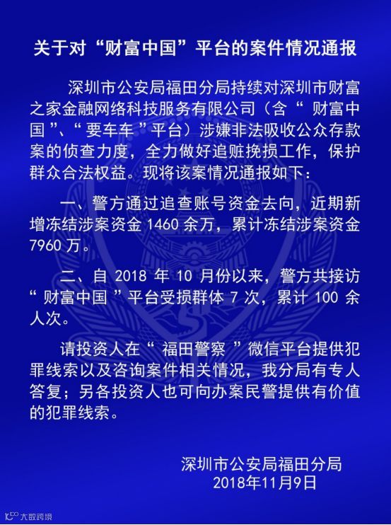 警方也通报了深圳市财富之家金融网络科技服务有限公司(含“财富中国”、“要车车”平台)涉嫌非法吸收公众存款侦查情况: