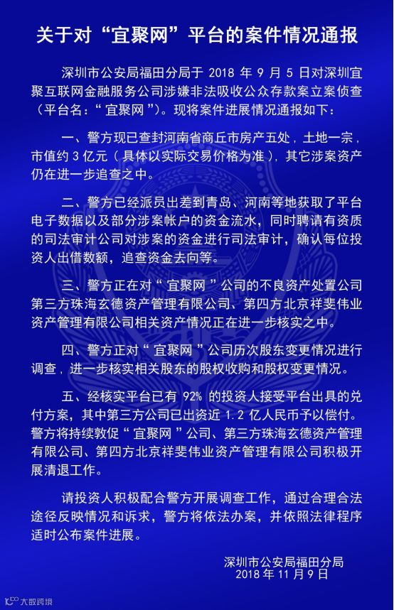 五、经核实平台已有92%的投资人接受平台出具的兑付方案,其中第三方公司已出资近1.2亿予以偿付。警方将持续督促“宜聚网”公司、第三方珠海玄德资产管理有限公司、第四方北京祥斐伟业资产管理有限公司积极开展清退工作。