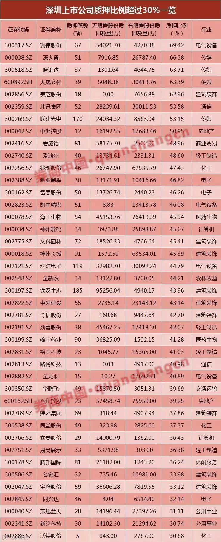 根据中国结算数据,截至10月12日,深圳A股上市公司中,有股权质押的共118家,占比超过40%。其中,质押比例超过30%的共有41只,8只股票质押比例超过50%,分别是珈伟股份、深大通、盛讯达、大晟文化、美芝股份、北讯集团、联建光电、中洲控股。