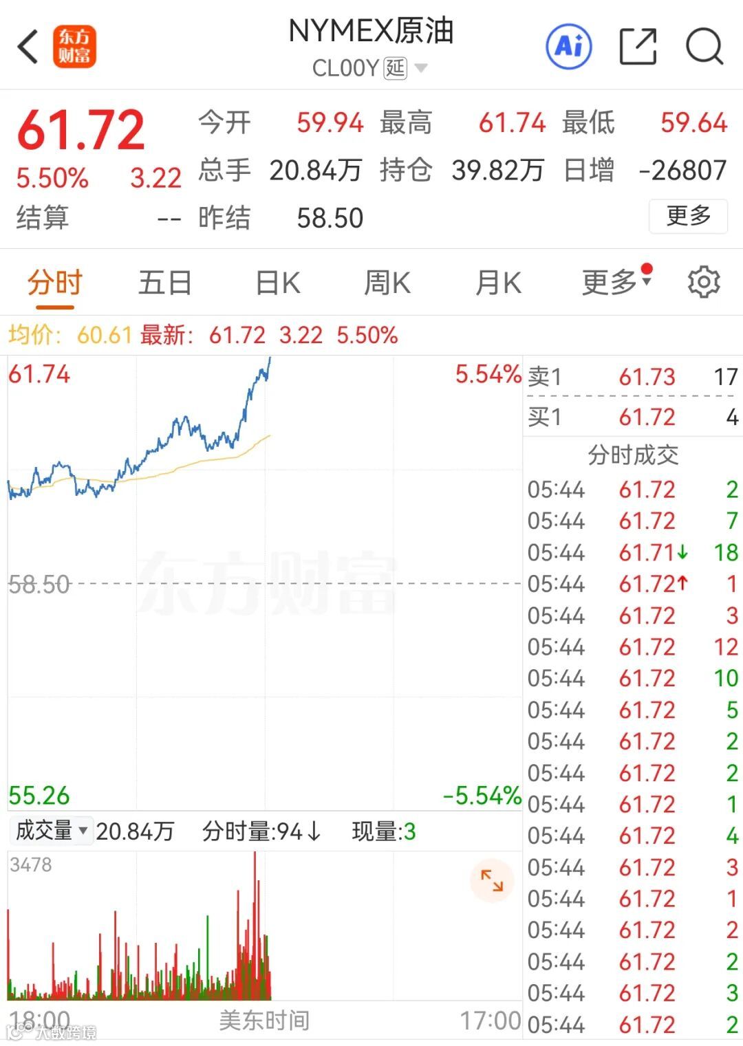 截至记者发稿时,WTI原油上涨5.50%报61.72美元/桶,ICE布油上涨5.26%报65.88美元/桶。而此前一天,WTI原油、ICE布油分别大涨3.74%、4.94%。