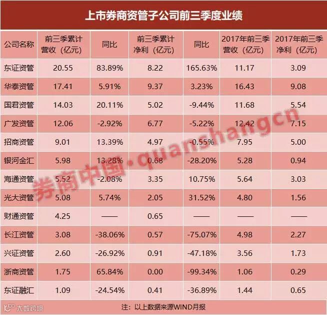今年前三季度,上市券商资管子公司累计营收超过10个亿的有:东证资管20.55亿、华泰资管17.41亿、国君资管14.03亿、广发资管12.06亿,同时这4家净利润都超过5个亿。而同比增长最快的也是东证资管,营收增幅93.89%,净利增长165.63%。