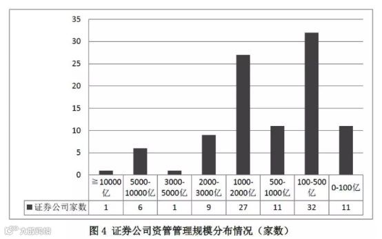 其中,资管规模在100-500亿区间的券商数量最多,有32家;其次是在1000-2000亿的券商有27家;500-1000亿的券商有11家;资管规模在2000-3000亿的有9家;而资管规模在5000-10000亿的券商有6家,超过10000亿的只有一家中信证券。