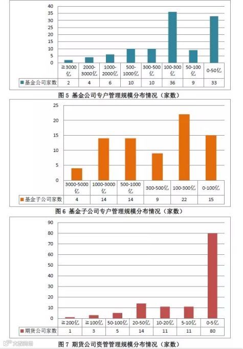 数据显示,截至2018年9月底,证券公司资管管理规模主要集中在100-2000亿元,基金公司专户管理规模主要集中在0-300亿元,基金子公司专户管理规模主要集中在100-1000亿元,期货公司资管管理规模主要集中在0-5亿元。