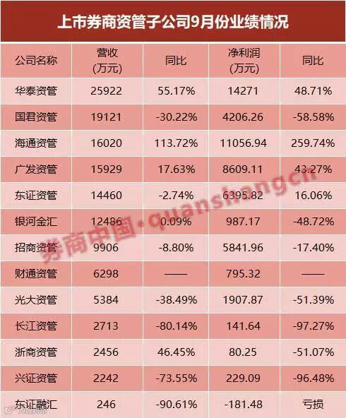 业绩方面,WIND数据统计,13家上市券商资管子公司9月份的净利润同比下降明显,长江资管、兴证资管、国君资管、浙商资管等净利同比下降都超过50%,东征融汇甚至出现单月亏损,不过大部分券商资管子公司净利相比8月份环比都有所好转。