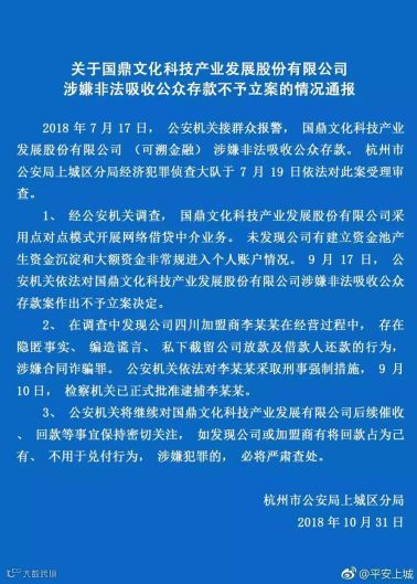 10月31日,杭州市公安局上城区分局发布通报称,对国鼎文化科技产业发展股份有限公司(可溯金融)涉嫌非法吸收公众存款案做出不予立案决定。