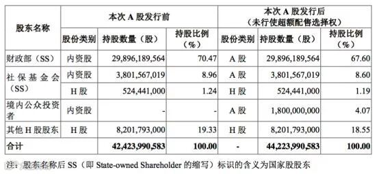 本次A股发行前,中国人保的总股本为42,423,990,583股。假定本次发行A股18亿股且未行使超额配售选择权,则A股发行完成后公司总股本为44,223,990,583股,股东持股情况如下: