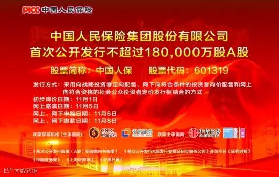 根据发行时间安排,中国人保初步询价日期为11月1日;网上路演日期为11月5日,届时公司高管、保荐人及承销商代表将与公众在线交流;网上、网下申购日为11月6日,缴款日为11月8日。