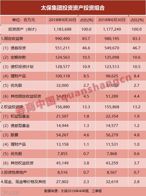 数据显示,这一投资策略基本延续至了三季度末。相较二季度末情况,至三季末,太保投资资产变动幅度相对较大的是固定收益类投资,该投资类别增加了102.95亿元,在投资资产中的占比上升了0.4个百分点。