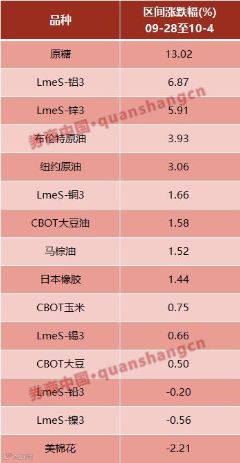 截至10月4日收盘,原油、原糖、伦铝、伦锌等纷纷大涨,涨幅均超过3%。其中,原糖期货连续五天大涨,涨幅逾10%;布伦特和美原油也创出四年新高,布油一度突破86美元关口;而另一个值得留意的品种——LME铝,则是平地起惊雷,周三受巴西铝冶炼厂停产的消息,单日暴涨6.4%。此外,伦铜、美豆油、马棕榈、日本橡胶涨幅也超过1%。
