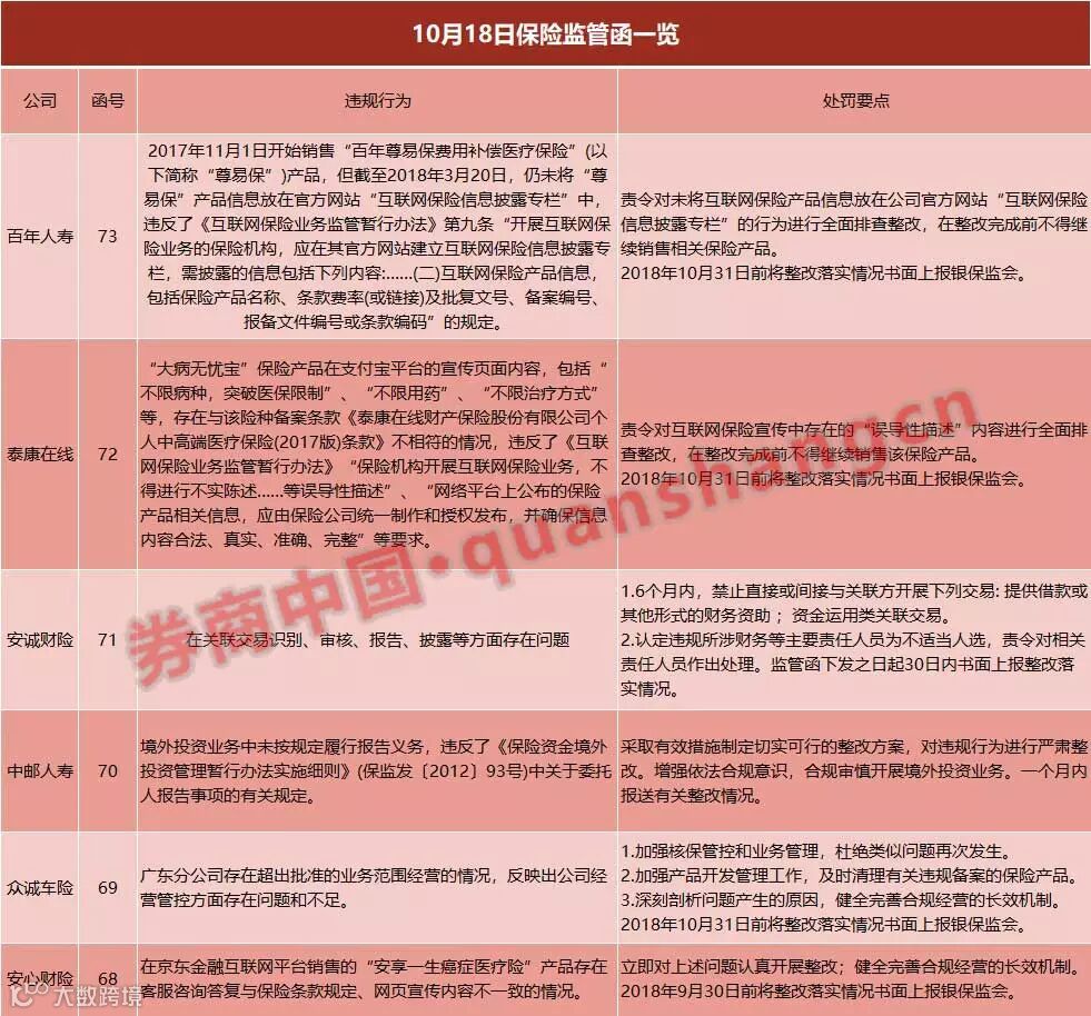 10月18日,银保监会还下发了6份监管函,其中3份涉及互联网保险业务,另外3份分别涉及关联交易、境外投资管理和超出批准的业务范围经营等问题。