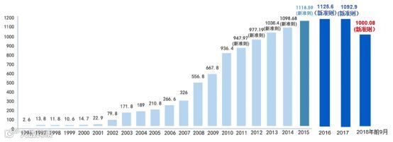 图:新华保险1996-2018年保费情况(单位:亿元)
