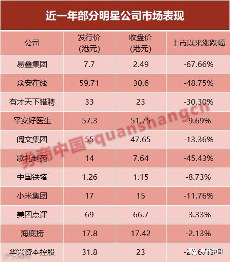 券商中国记者查询整理了去年以来的诸多知名内地赴港的公司股价表现情况,发现基本都处于破发状态,上市至今表现都为负数。
