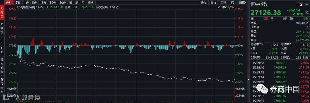 港交所国庆节后第一个交易日,恒生指数低开0.26%,后续持续走低,截至收盘,报收27126.38点,下跌2.38%。