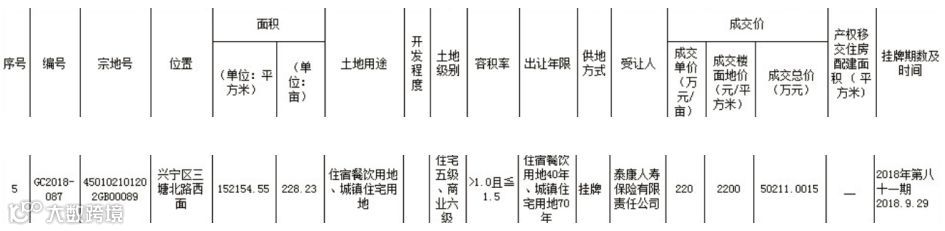 泰康人寿竞得的GC2018-087地块位于兴宁区三塘北路西面,出让总面积为15.22万平方米,折合228.23亩,土地用途为住宿餐饮用地、城镇住宅用地,土地使用年限为住宿餐饮用地40年、城镇住宅用地70年。