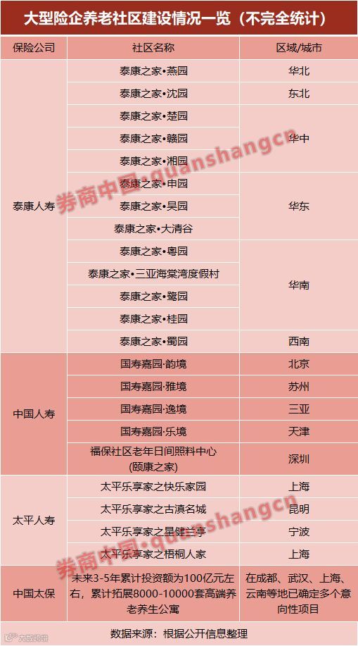 目前养老社区建设具有一定规模的主要是泰康人寿、中国人寿、太平人寿、合众人寿等公司。