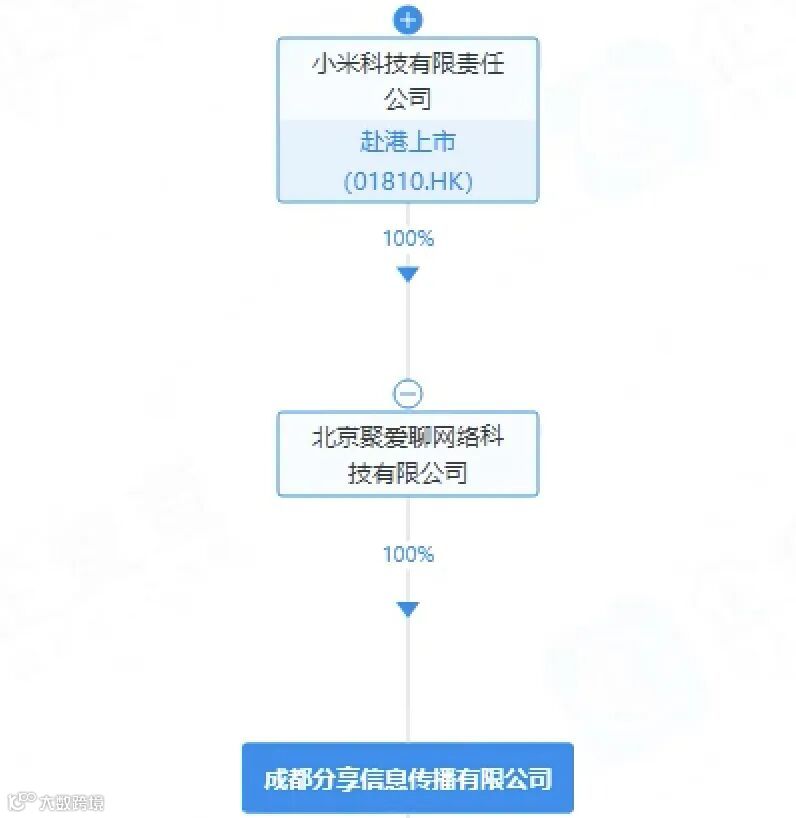 据应用商城页面显示,围观短剧APP归属于成都分享信息传播有限公司,其注册资本为1000万元,法定代表人王川为小米科技联合创始人、高级副总裁。经股权穿透可见,该公司由北京聚爱聊网络科技有限公司100%持股,后者则由小米科技有限责任公司全资持有。