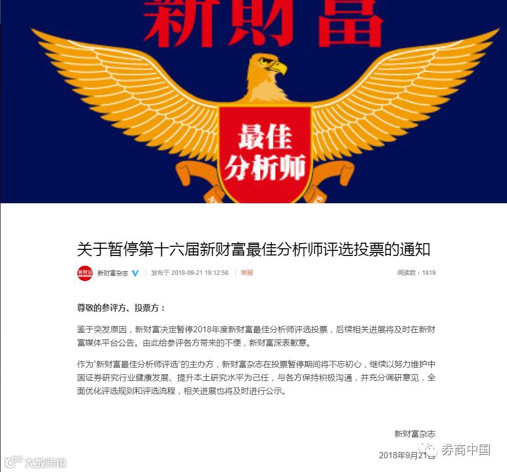 新财富方面称,鉴于突发原因,新财富决定暂停2018年度新财富最佳分析师评选投票,后续相关进展将及时在新财富媒体平台公告。由此给参评各方带来的不便,新财富深表歉意。作为“新财富最佳分析师评选”的主办方,新财富杂志在投票暂停期间将不忘初心,继续以努力维护中国证券研究行业健康发展、提升本土研究水平为己任,与各方保持积极沟通,并充分调研意见,全面优化评选规则和评选流程,相关进展也将及时进行公示。