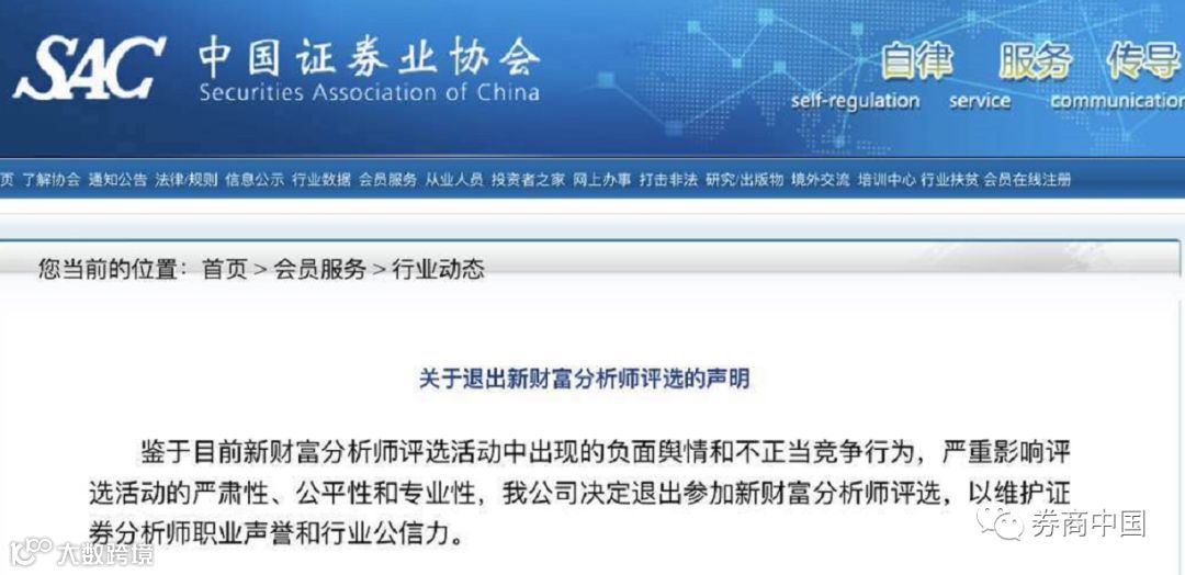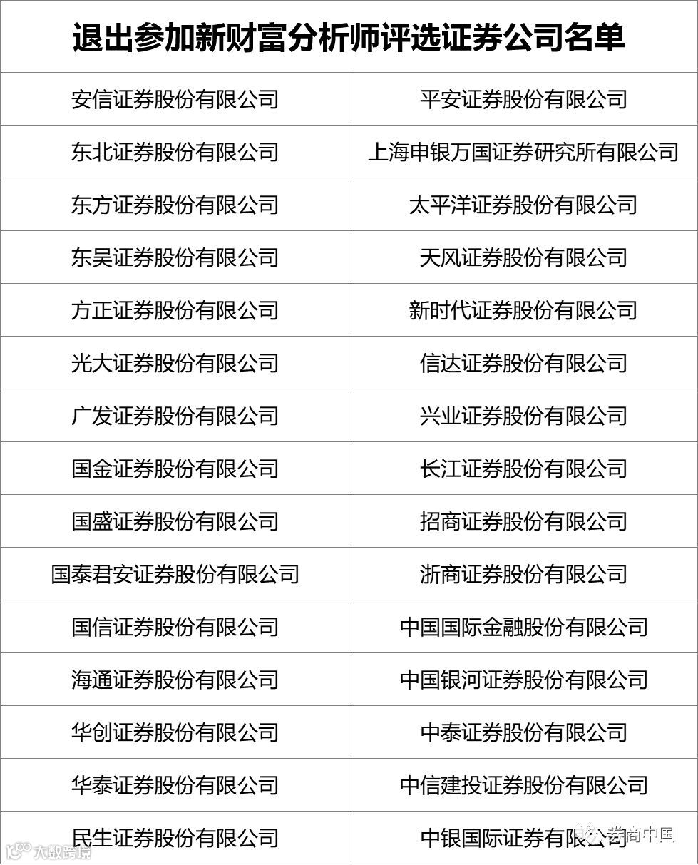 鉴于目前新财富分析师评选活动中出现的负面舆情和不正当竞争行为,严重影响评选活动的严肃性、公平性和专业性,我公司决定退出参加新财富分析师评选,以维护证券分析师职业声誉和行业公信力。这30家券商分别是: