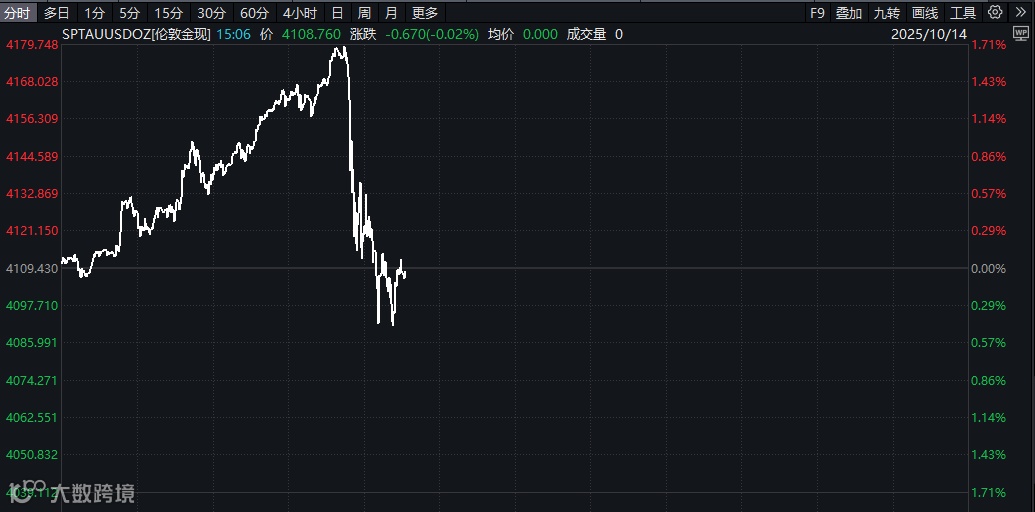 不过,午后,金价突然直线跳水至翻绿,最低触及4089.885美元/盎司,较日内高点跳水超2%。截至记者发稿时,现货黄金报4108.76美元/盎司,下跌0.02%。年初以来,金价的涨幅仍超过56%。