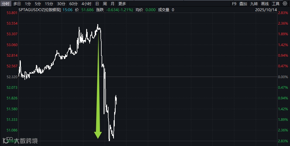 然而,下午13时35分过后,现货白银开启直线跳水模式,从53.45美元/盎司的高位,最低下探至50.839美元/盎司,日内涨跌幅从+2.16%变为-2.83%。截至记者发稿时,现货白银报51.686美元/盎司,下跌1.21%。