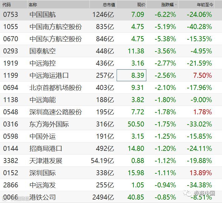 在今天港股市场上,交通运输服务板块快速下跌,航空股全线跳水。特别是中国国航,一度跌幅超过6%,成为领跌股。今年以来,中国国航跌幅已经达到24%。而南方航空跌幅更为明显,年初至今跌幅达到了40.28%。