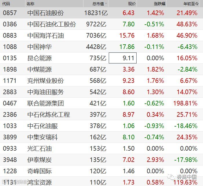 与交通运输板块的持续下跌相比,原油能源板块表现不错。国内最大的原油生产企业——中国石油今天一度涨幅达到1.42%。从今年初至今,中石油已经累积上涨达到了21.49%。中石化涨幅达到了48.63%,中海油涨幅达到了46.90%,表现更为突出。