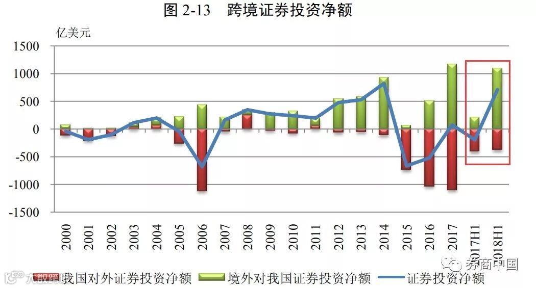 2018年上半年,我国推出多项改革措施,资本市场对外开放程度不断提升,证券投资项下总体呈现净流入状态。