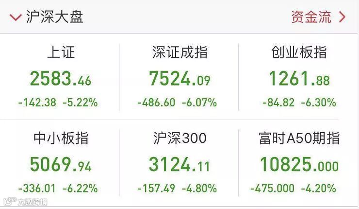 受美股昨夜大跌影响,A股早盘便大幅低开,开盘不久,沪指便跌穿“熔断底”。截至收盘,沪指大跌5.22%,创两年半最大单日跌幅,2600点关口失守;深成指跌6.07%,创业板指跌6.3%。两市累计蒸发2.67万亿元。