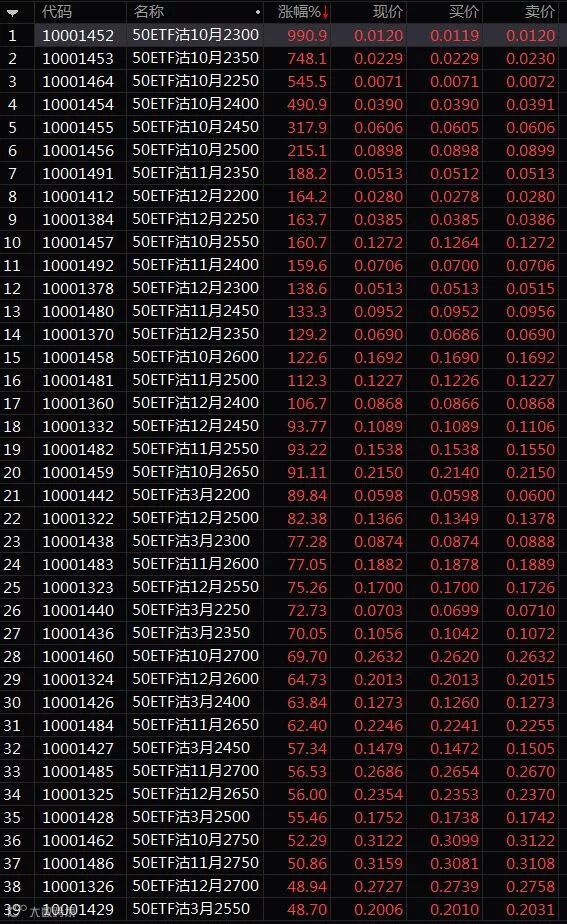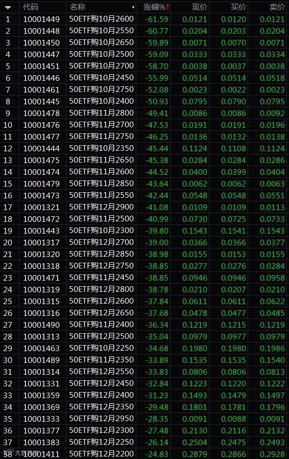 截止收盘,认购期权一片惨绿,最高跌幅达61.59%。