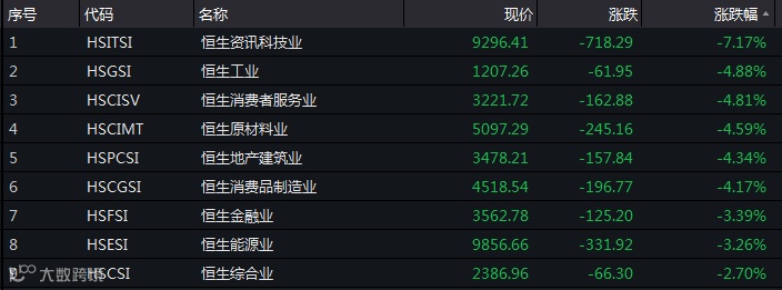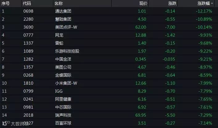 从板块涨跌来看,资讯科技业跌幅最大,达7.17%。板块中通达集团、慧聪集团和美团点评跌幅超过10%。
