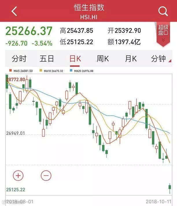 港股开盘大跌,随后维持低位震荡,盘中一度危及25000点大关,临近尾盘,跌幅有所收窄,截至收盘,恒指下跌3.54%,创一年来新低。市值一日蒸发5.61万亿。