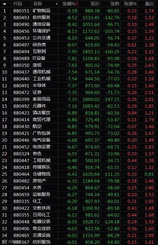 板块方面,各大板块全部重挫,跌幅最小的是银行板块,但跌幅也高达3.26%。整体来看,56个板块指数中,48个跌幅超过5%。其中,矿物制品跌幅超过9%,软件服务、通信设备、环境保护、公共交通等跌幅超过8%。