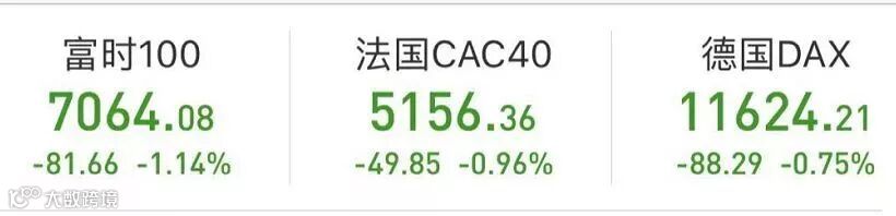 截至券商中国发稿,欧洲三大股指跌幅有所缩窄,英国富时100指数跌1.14%,法国CAC40指数跌0.96%,德国DAX 指数跌0.75%。