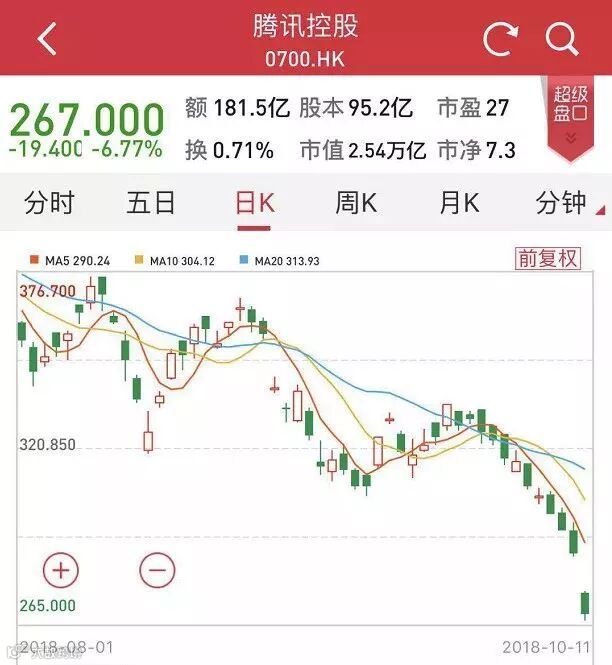 作为港股股王——腾讯控股今日继续下跌,跌幅高达6.77%,报收267港元,市值一日蒸发逾1900亿港元。