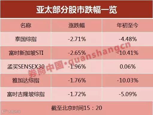 此外,其他国家股市也处于下跌态势。截至北京时间15:20,泰国综指跌2.71%,富时新加坡STI跌2.65%,雅加达综指跌1.76%。