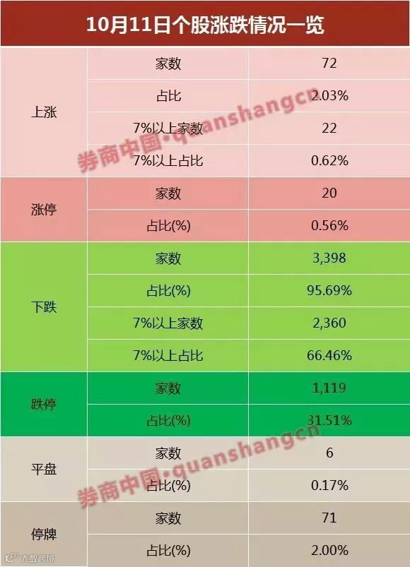 个股方面,两市仅72个上涨,占比仅2.03%。下跌个股多达3398只,占比高达95.69%,其中,跌停个股共计1119只,占比31.51%,即今日两市超三成个股跌停。