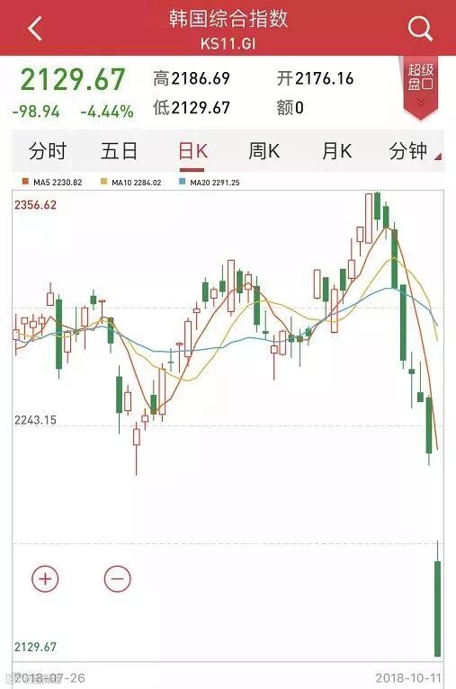 韩国综合指数跌幅更大,今日大跌4.44%。