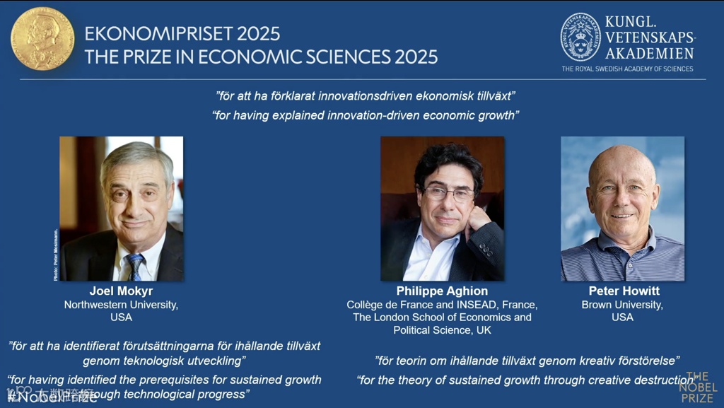 10月13日,2025年诺贝尔经济学奖得主揭晓。瑞典皇家科学院决定将2025年度瑞典中央银行纪念阿尔弗雷德·诺贝尔经济学奖授予乔尔·莫基尔(Joel Mokyr)、菲利普·阿吉翁(Philippe Aghion)和彼得·豪伊特(Peter Howitt),以表彰他们“对创新驱动型经济增长的阐释”。