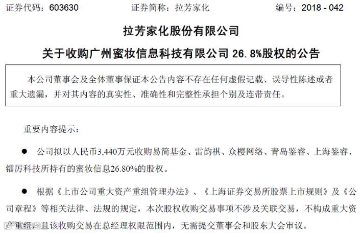5月15日晚间,拉芳家化公告,公司拟3440万元收购蜜妆信息26.8%的股权。蜜妆信息主营业务为自媒体原创内容运营、自有彩妆品牌“MeetDay”的品牌管理和运营。