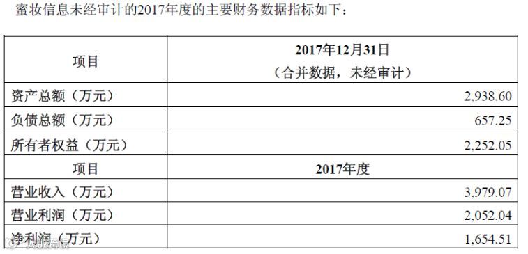 以今年总价相对较低收购案例——拉芳家化收购的蜜妆信息为例,2017年度,蜜妆信息实现营业收入3,979.07万元,净利润1,654.51万元。而拉芳家化今年上半年共实现净利润8344.64万元,去年全年为1.38亿元。