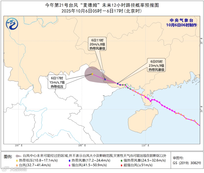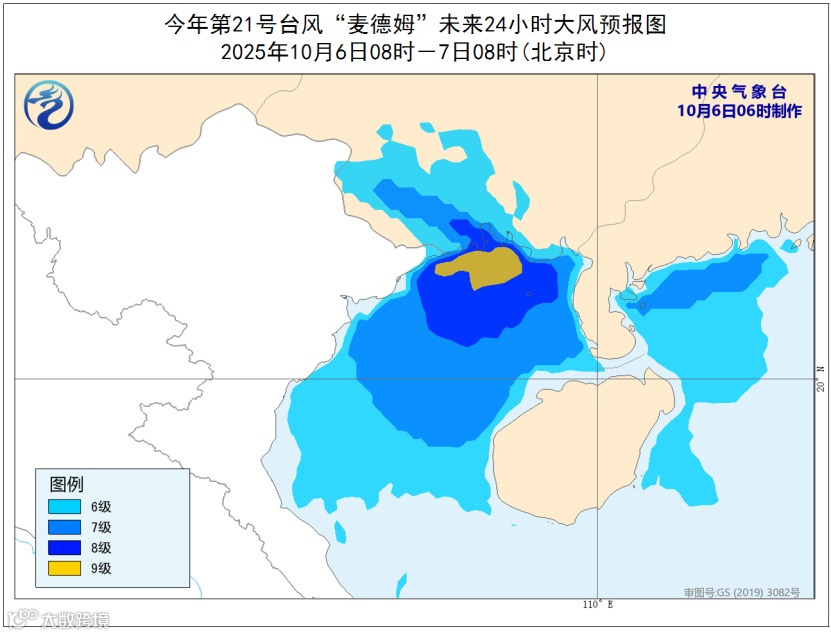 大风预报:10月6日8时至7日8时,南海西北部、北部湾、广西南部及沿海、广东西南部沿海、海南岛沿海将有6-7级、阵风8-9级的大风,其中,北部湾北部、广西南部部分沿海风力有8-9级、阵风10-11级。