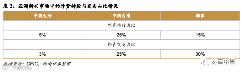 西南证券研报中提到,从资金层面看,当A股全部纳入时,增量资金将超过2万亿元。而从投资者结构看,外资机构投资者比重将显著增加,这将改变A股的投资者结构和交易习惯。从亚洲新兴市场的经验来看,加入MSCI后,外资机构的持股比重显著提升,有望提高到20%左右(中国台湾从不足5%提高到25%,韩国从3%提高到15%)。同时外资在全市场的交易占比也将显著提高到25%左右(中国台湾从3%提高到25%,韩国从3%提高到30%)。