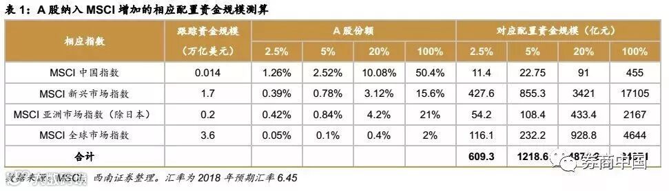 西南证券表示,A 股将以循序渐进的方式逐步提升在 MSCI 中所占份额。当 A 股的市值比重为2.5%时,新纳入的 A 股将在 MSCI 中国指数、MSCI 新兴市场指数、MSCI 亚洲市场指数(除日本)和 MSCI 全球市场指数中分别占 .26%、0.39%、0.42% 和 0.05%的份额,对应配置资金规模在600亿元(人民币)左右。
