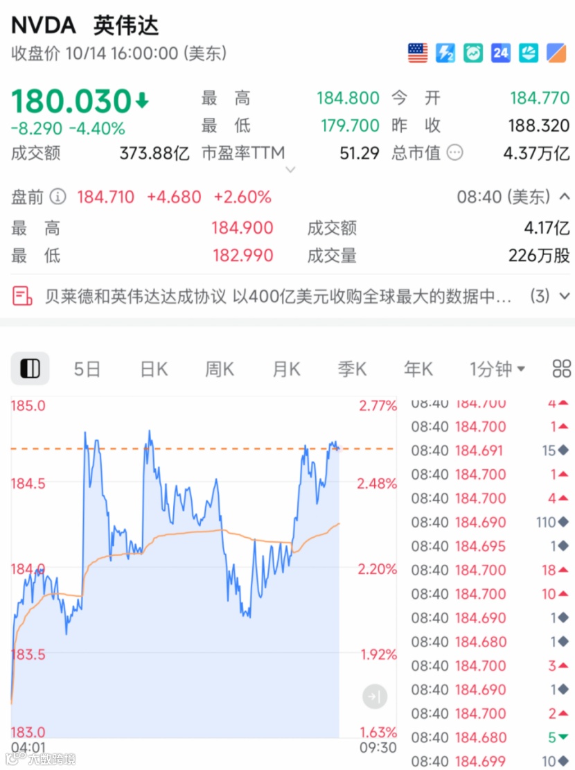 据最新报道,英伟达、xAI、微软以及贝莱德等公司组成的投资财团将以400亿美元(约合人民币2850亿元)收购Aligned数据中心公司。与此同时,汇丰银行将英伟达的目标价格大幅上调至320美元。若实现该目标,英伟达总市值将升至7.78万亿美元。