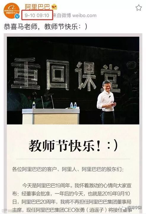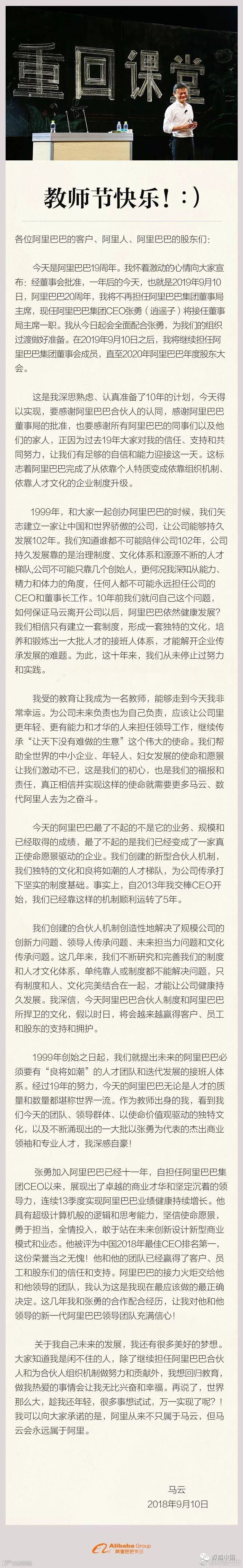 9月10日9点10分,马云认真准备了10年的“公司传承计划”终于宣布了: