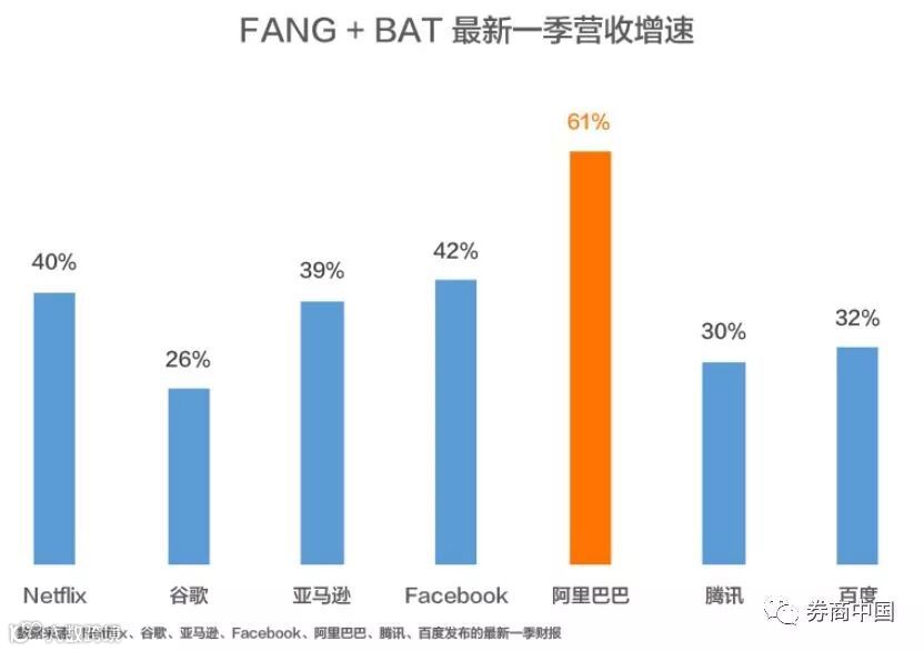当季,阿里巴巴实现收入809.2亿元,同比增长61%,不仅高于腾讯、百度等国内同行,也超过FANG(Facebook、亚马逊、Netflix、谷歌)等世界顶尖的互联网巨头。