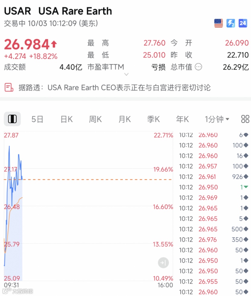 美股稀土概念股全线爆发,USA Rare Earth公司股价一度暴涨超22%。消息面上,该公司首席执行官Barbara Humpton确认公司正与美国白宫进行讨论。