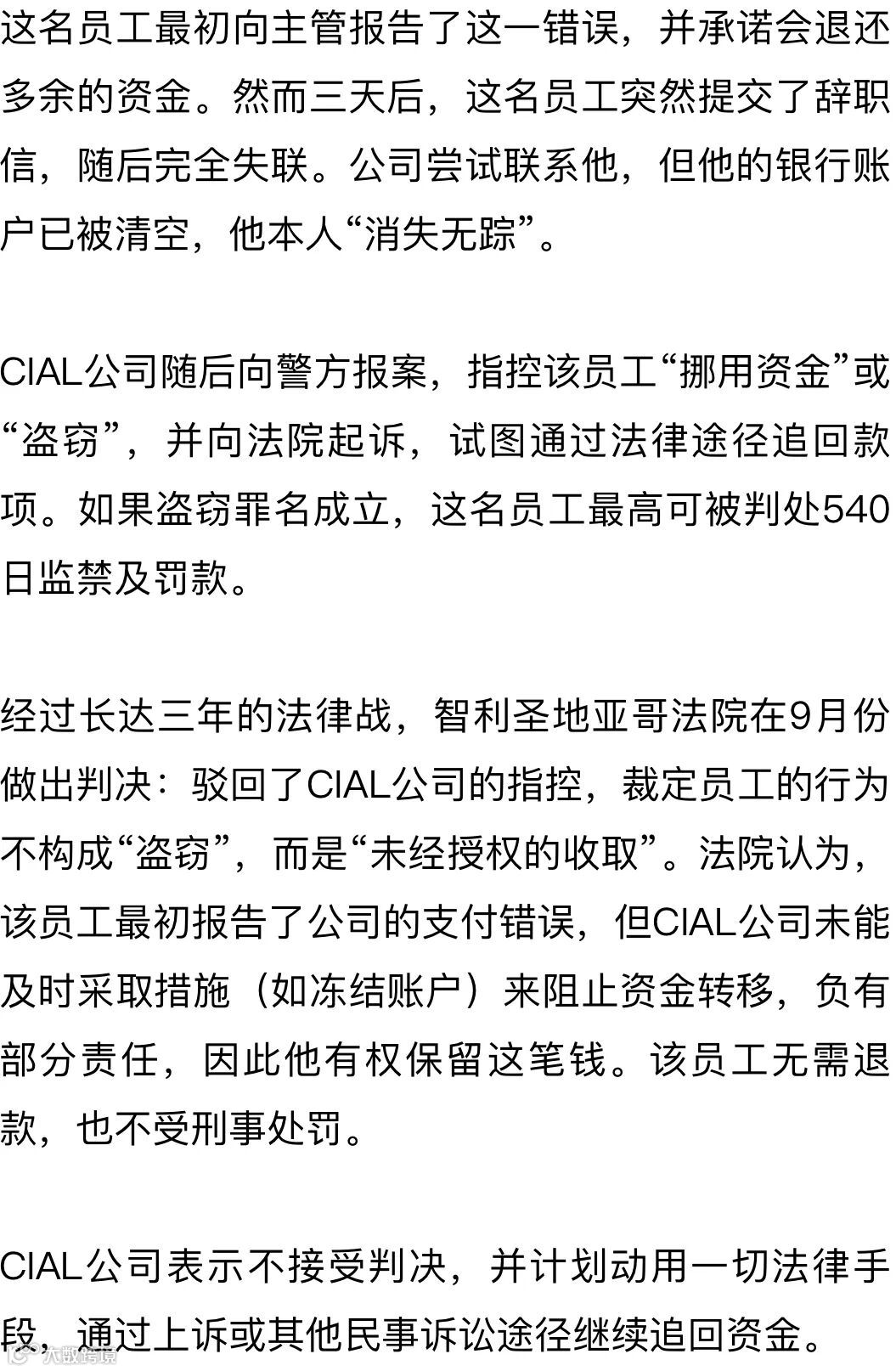 智利一家公司给员工错发相当于330倍月工资的巨款,这名员工收到钱后辞职失踪。该公司向法院起诉追讨,历经三年审判后,法院近日判决公司败诉,无法以刑事途径追讨款项。